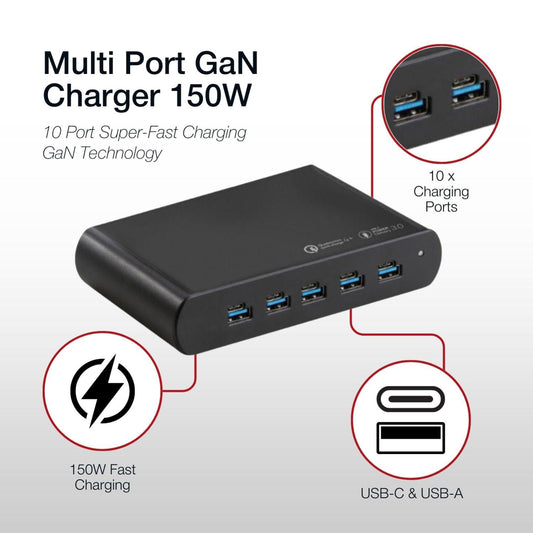 Shintaro 200W 10-Port GaN USB-C Charger - Simultaneous Fast Charging for iPads, Tablets, Smartphones with Smart Cooling and Protection