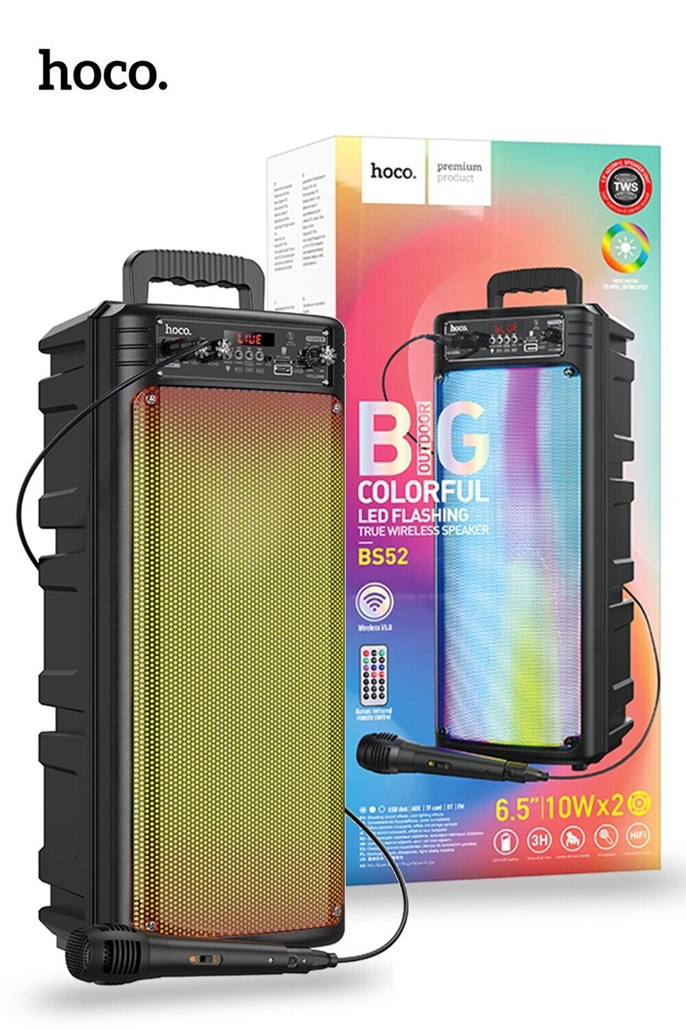 Moreover, the BS52 comes complete with a wired microphone, providing the convenience of making announcements or singing along with your preferred tracks. The added touch of coloured lights creates a captivating ambience, elevating your entertainment experience to new heights.