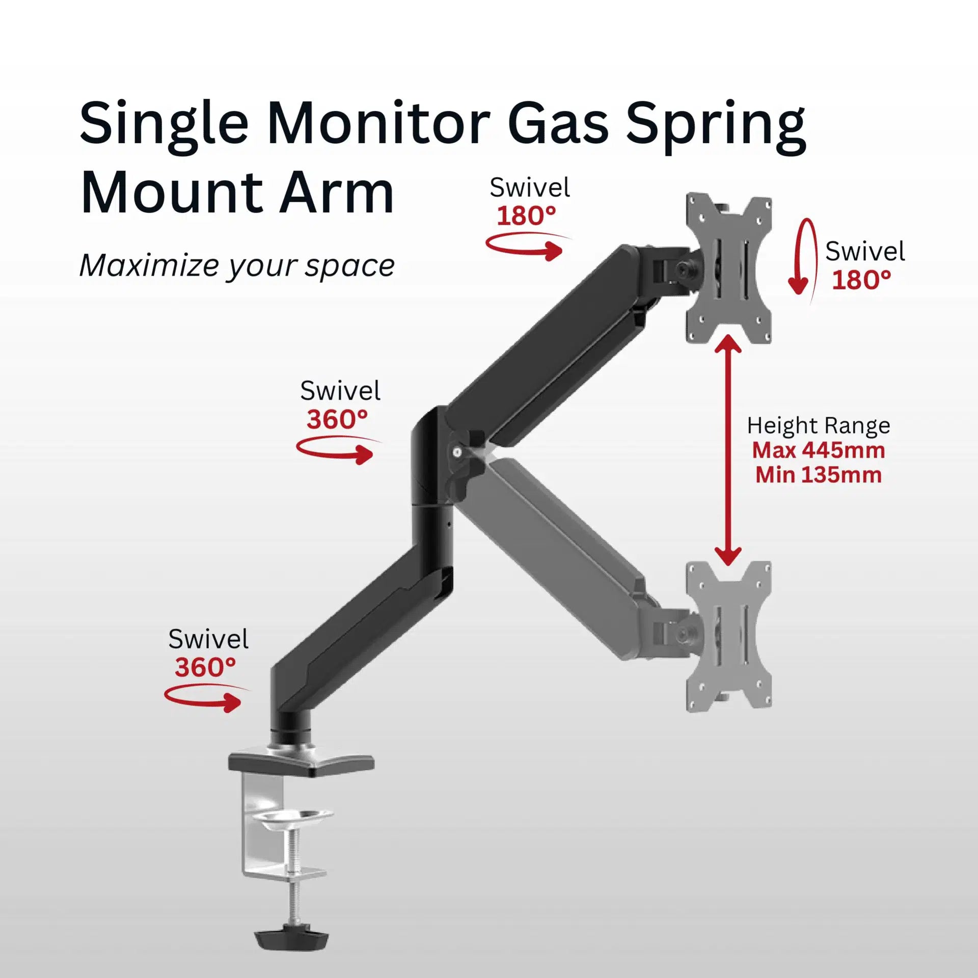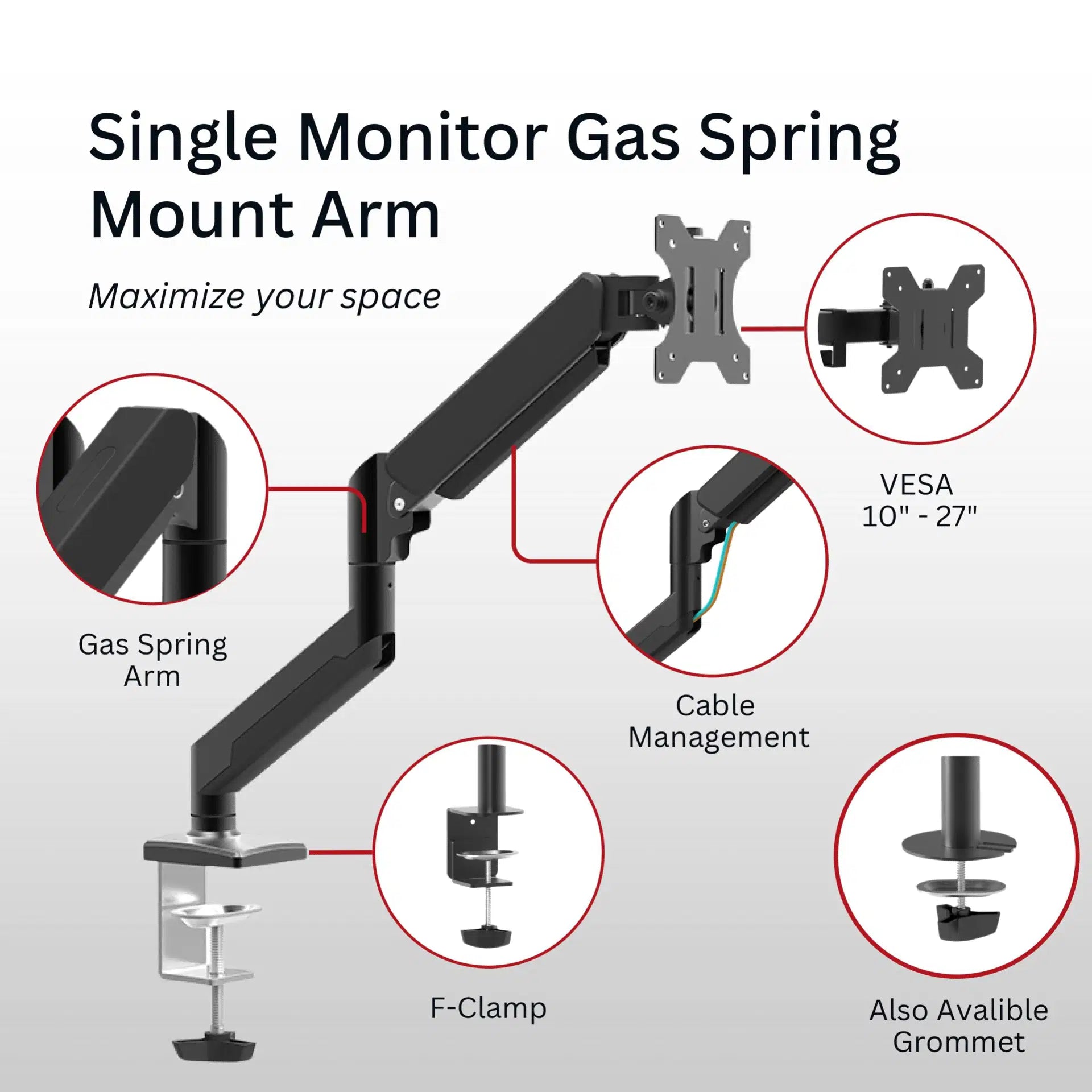 Gas spring Single Monitors Desktop Bracket. Both desk clamp and grommet are included