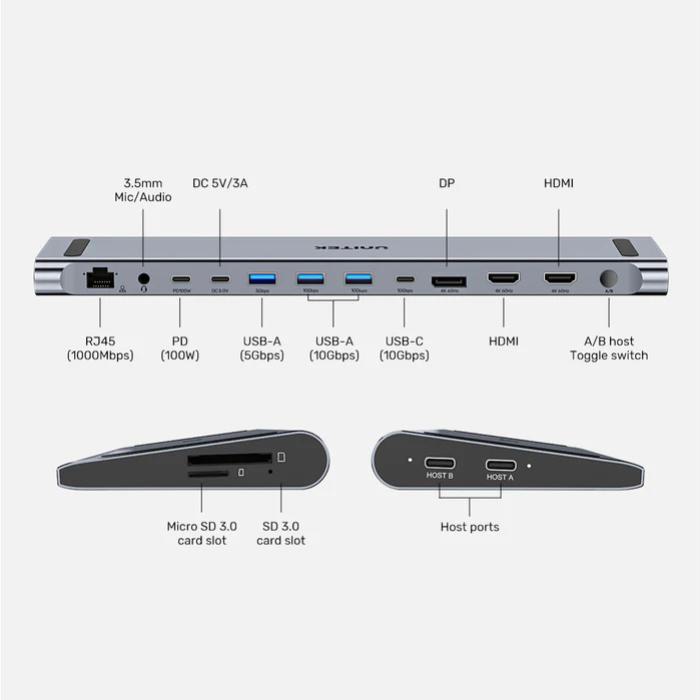 Unitek uHUB15+ USB-C Triple 4K KVM Docking Station, 2x 5Gbps, 1x 10Gbps, 3x 10Gbps, 1x PD 100W, 1x DC5V, Grey